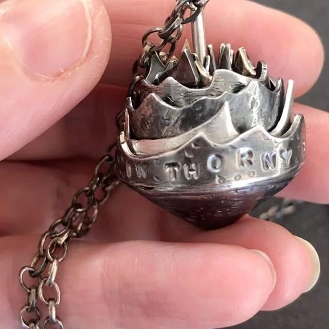 Layers of thorns, like waves, turn around a central mast as individual thorns ripple on the surface. Calm or stormy the mast remains constant. I made this piece with both display & play in mind - of course you can wear it & have both. The chain is removable, then it becomes a spinning top.